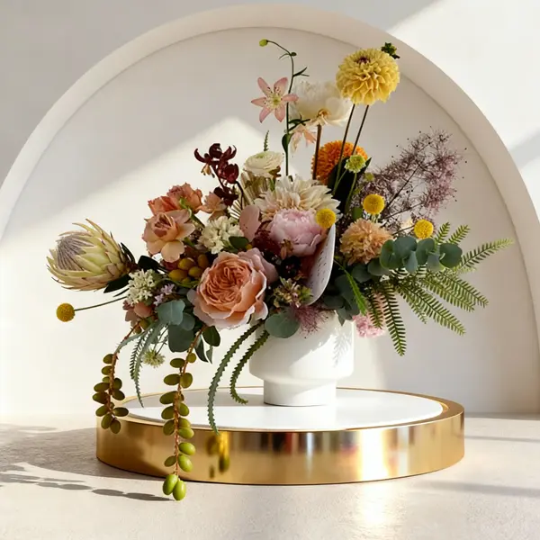 Experience refined beauty with Golden Serenity, a stunning floral arrangement that blends soft peach roses, golden dahlias, and delicate greenery in a sleek white vase. Its golden hues and organic textures bring warmth and sophistication to any setting — ideal for home décor, weddings, or elegant gifting.