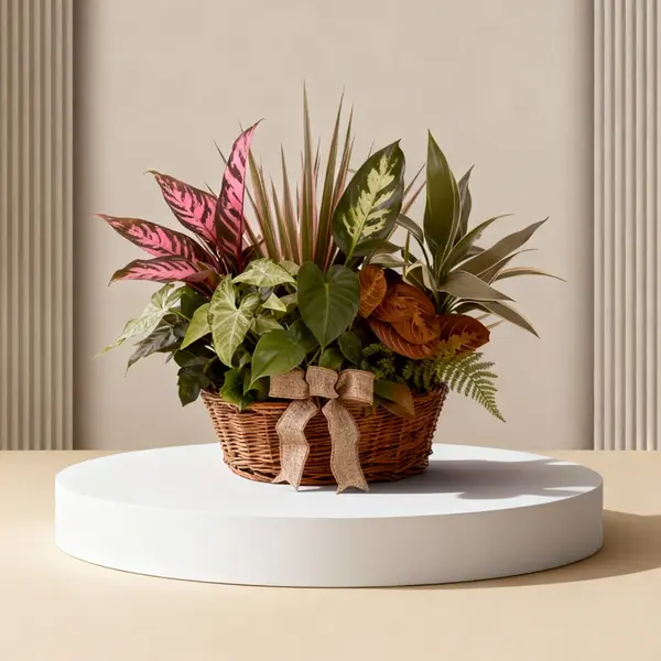 Bring natural balance to your space with Tropical Harmony, a lush indoor plant arrangement that blends vibrant pink, green, and bronze-toned leaves in a charming wicker basket. Designed to add a touch of freshness and color, it’s perfect for home or office décor, offering a refined tropical feel that never fades.